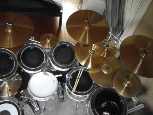 Die beiden Roto-Toms sind meines Wissens Originale in den Großen 10″ und 12″. (ohne Felle)