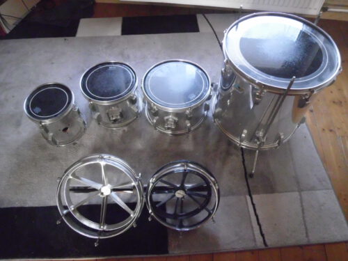 Die Toms in 12″ und 16″ sind wohl selbe Serie (siehe Emblem und Böckchen); allerdings mit Chromfolie beklebt (nicht von mir).