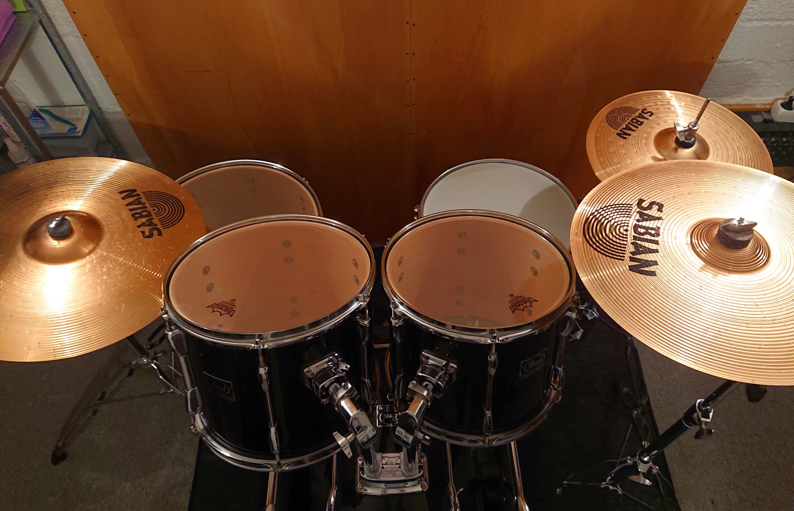 Kessel: 22″ BD – 12-13-16″ Toms + 14×5″ Sonor Steel Snare