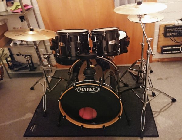 Kessel: 20″ BD – 10-12-14″ Toms + 14×5″ Snare (Evans Hydraulic Fell in Rot)