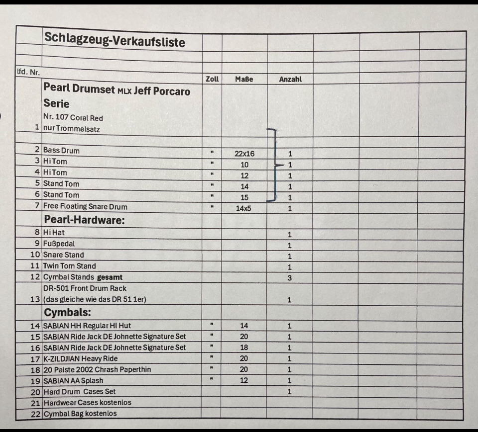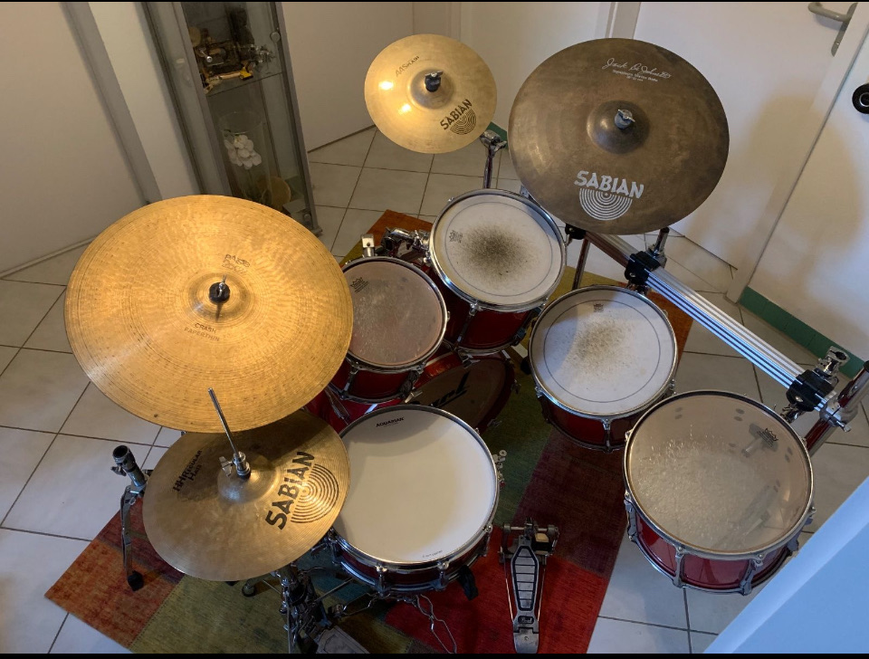 Hallo Schlagzeugbegeisterte, ich, als professioneller Studio- und Live Schlagzeuger zudem langjähriger Dozent an der HMTM, biete hier mein gut erhaltenes und vollfunktionsfähiges PEARL Drumset MLX, Farbe Red Grain an. Es handelt sich um ein vollständiges Paket. Die Größen und Einzelteile sind aus beigefügten Liste ersichtlich. Das Schlagzeug ist gebraucht und in einem sehr guten und gepflegten Zustand . Lediglich geringfüge Gebrauchspuren. Ein kompletter Satz Drumheadpack wird dazu gegeben. Das Set wurde vorwiegend im Studio gespielt. Der Neupreis für dieses Komplett-Paket liegt deutlich über dem angebotenen Preis. Das Set kann nach Absprache bei mir besichtigt und angespielt werden. Gerne nehme ich ernst gemeinte Anfragen entgegen.
