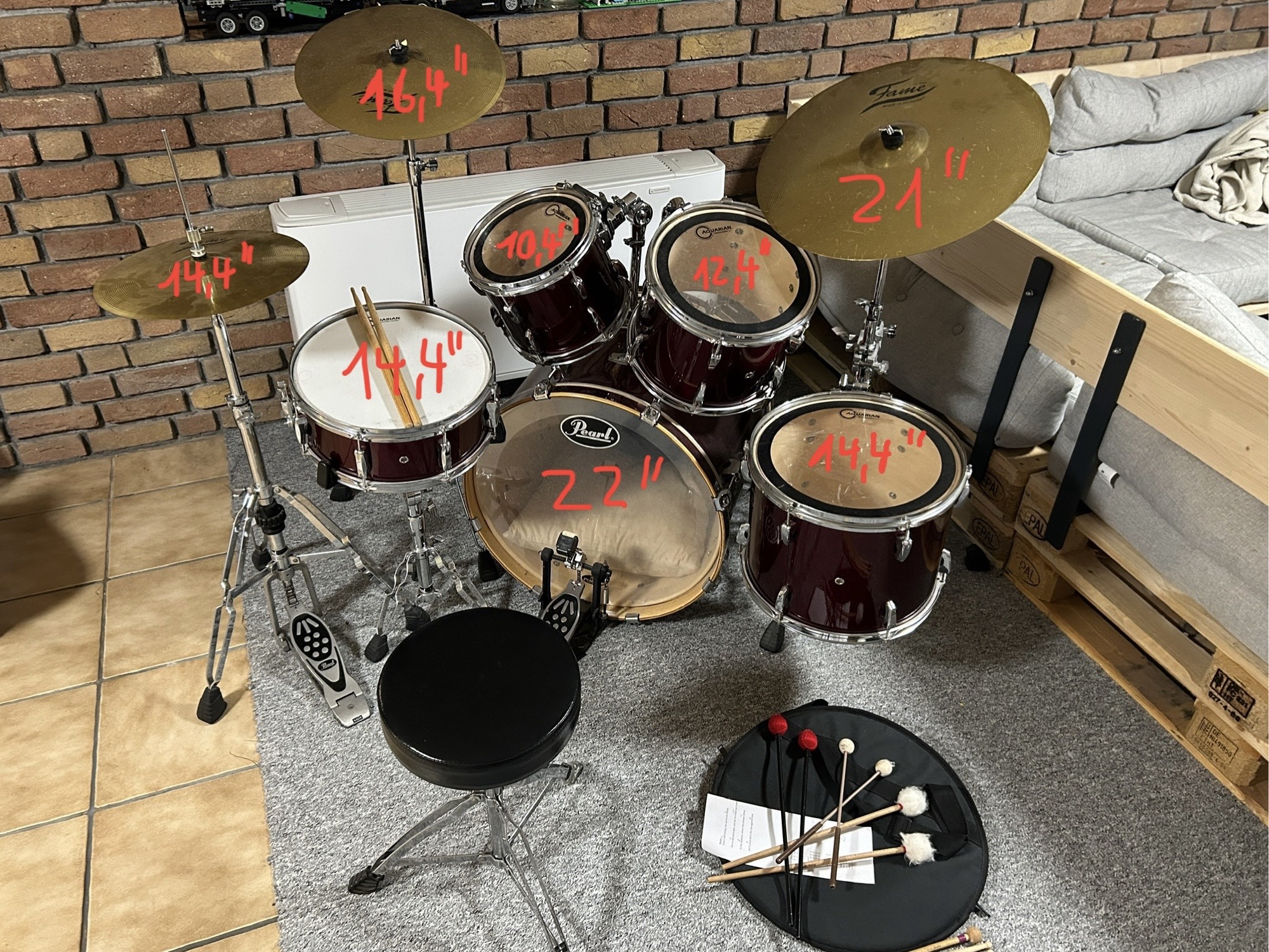 Mit Bassdrum (22Zoll) , Snare Drum, Tomtoms, Hi-Hat und verschiedene Becken. Zusätzlich verschiedene Schlagzeugstöcke (Drumsticks) und ein Hocker!