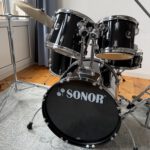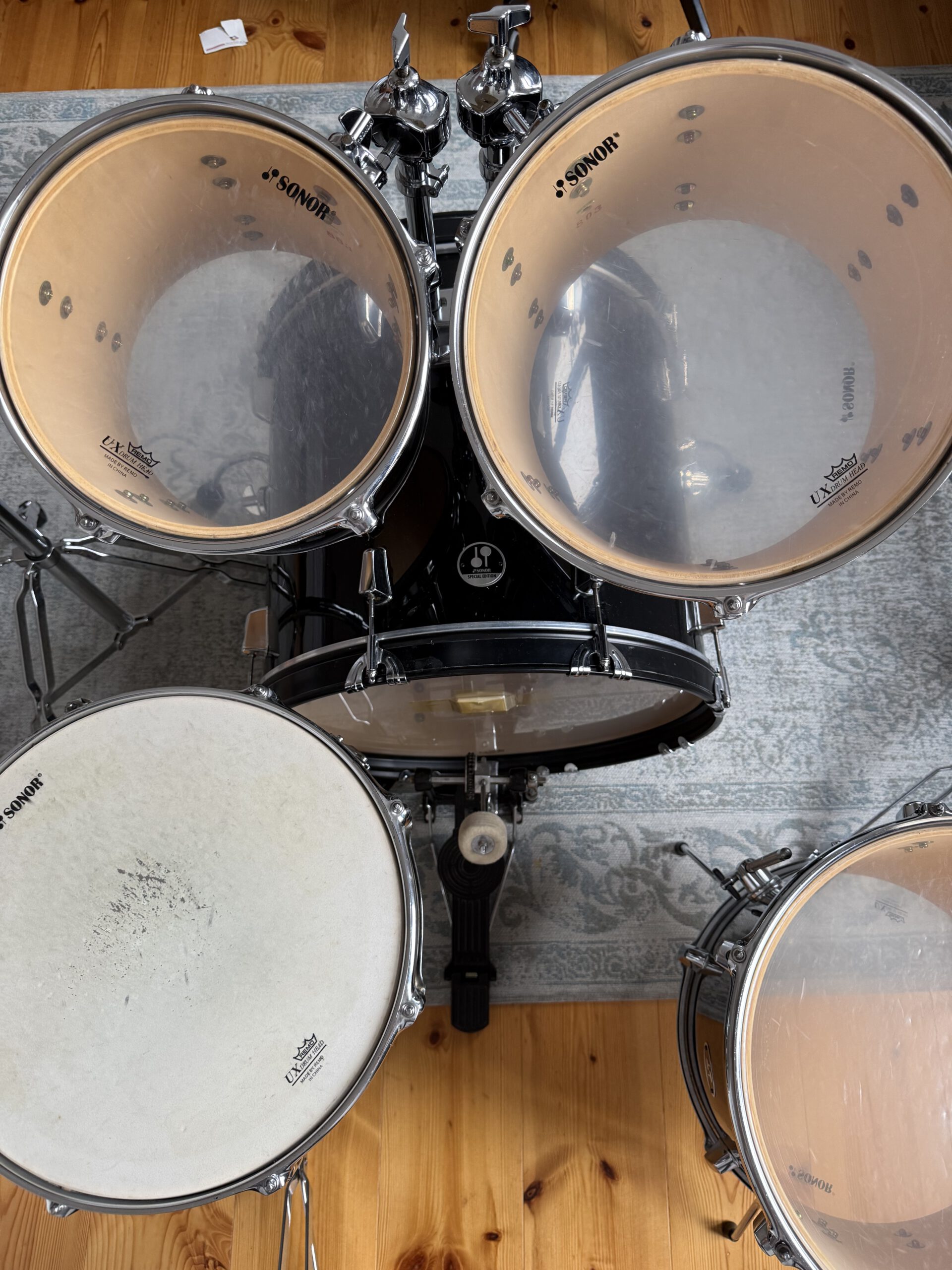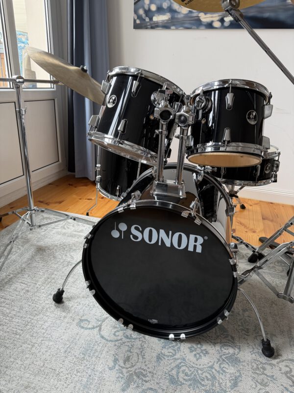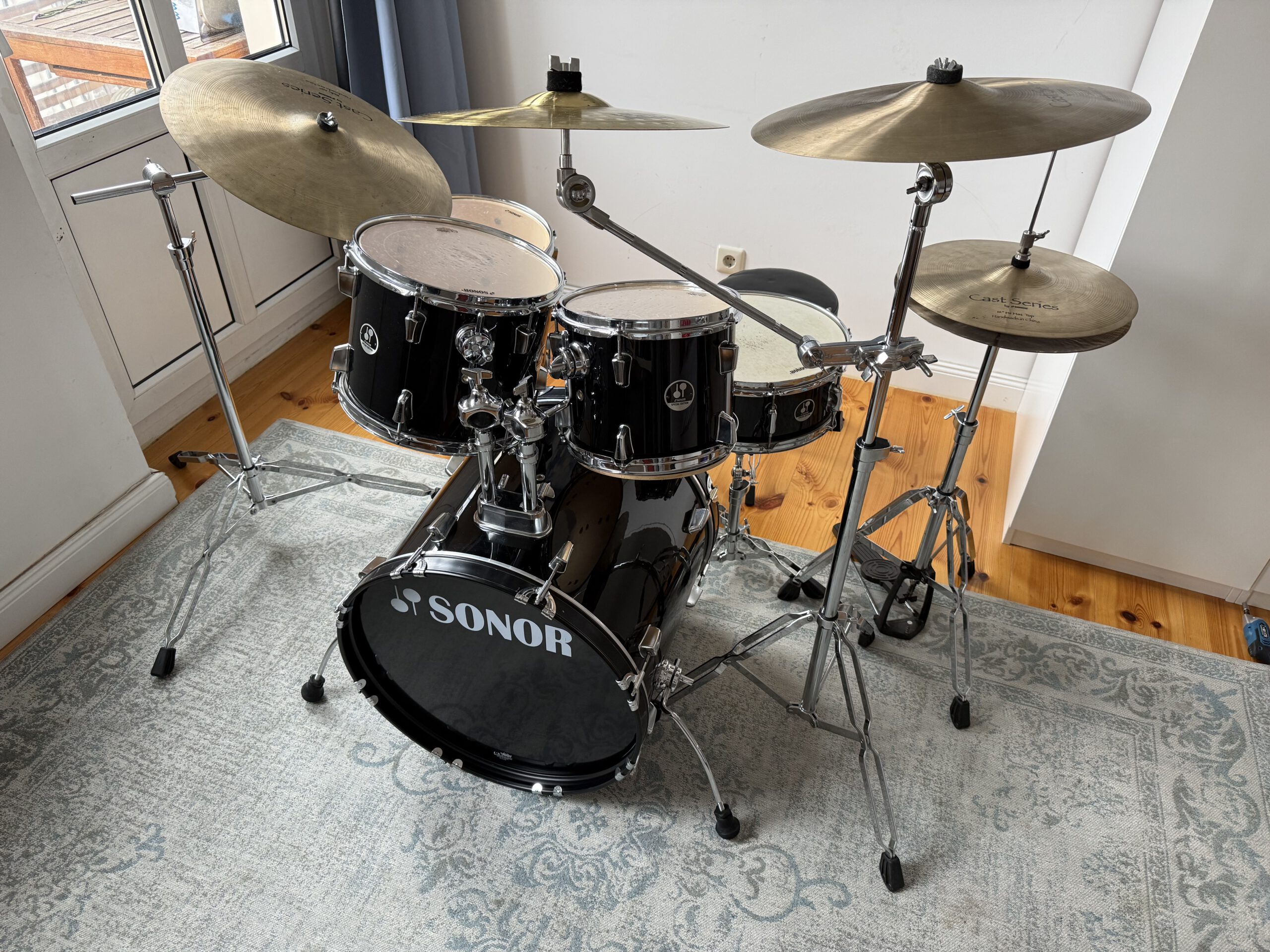 Zum Verkauf steht ein SONOR Schlagzeug-Komplettset in schwarzem Finish.