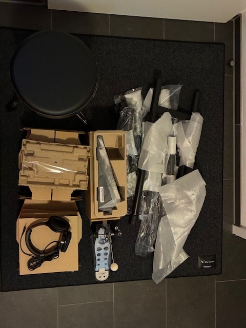 Für den Preis bekommt man ein Roland E-Drum Set, einen TAMA Drum-Hocker, eine Fußmatte und Roland Kopfhörer.