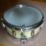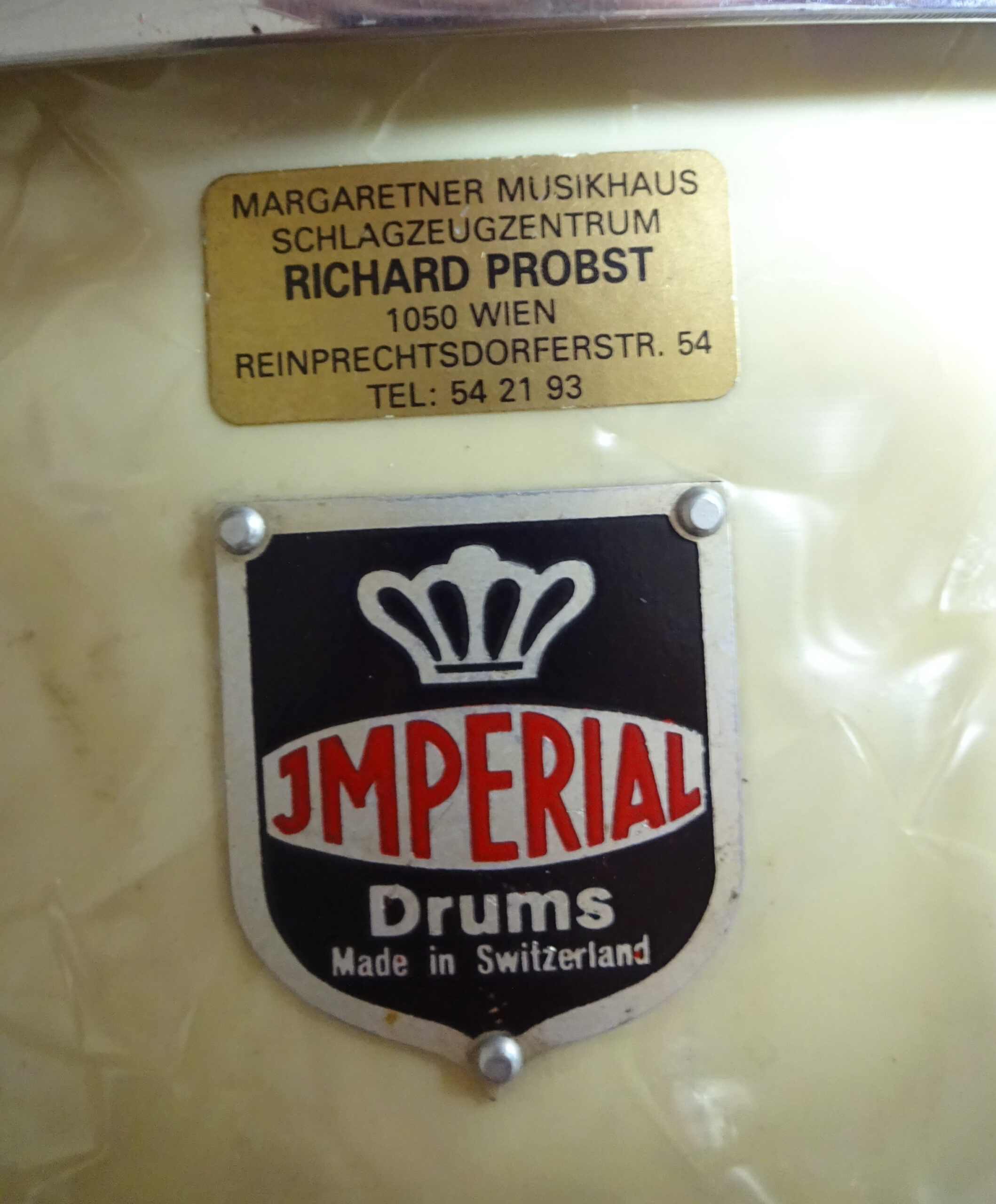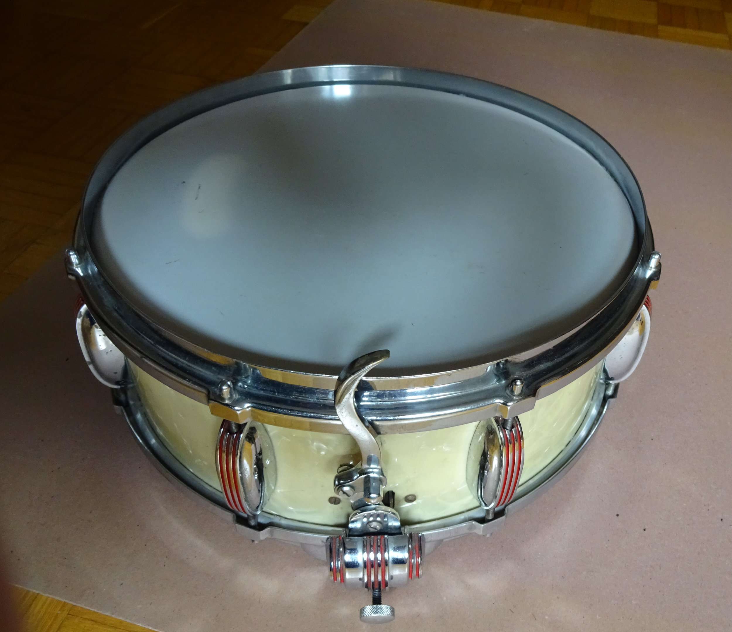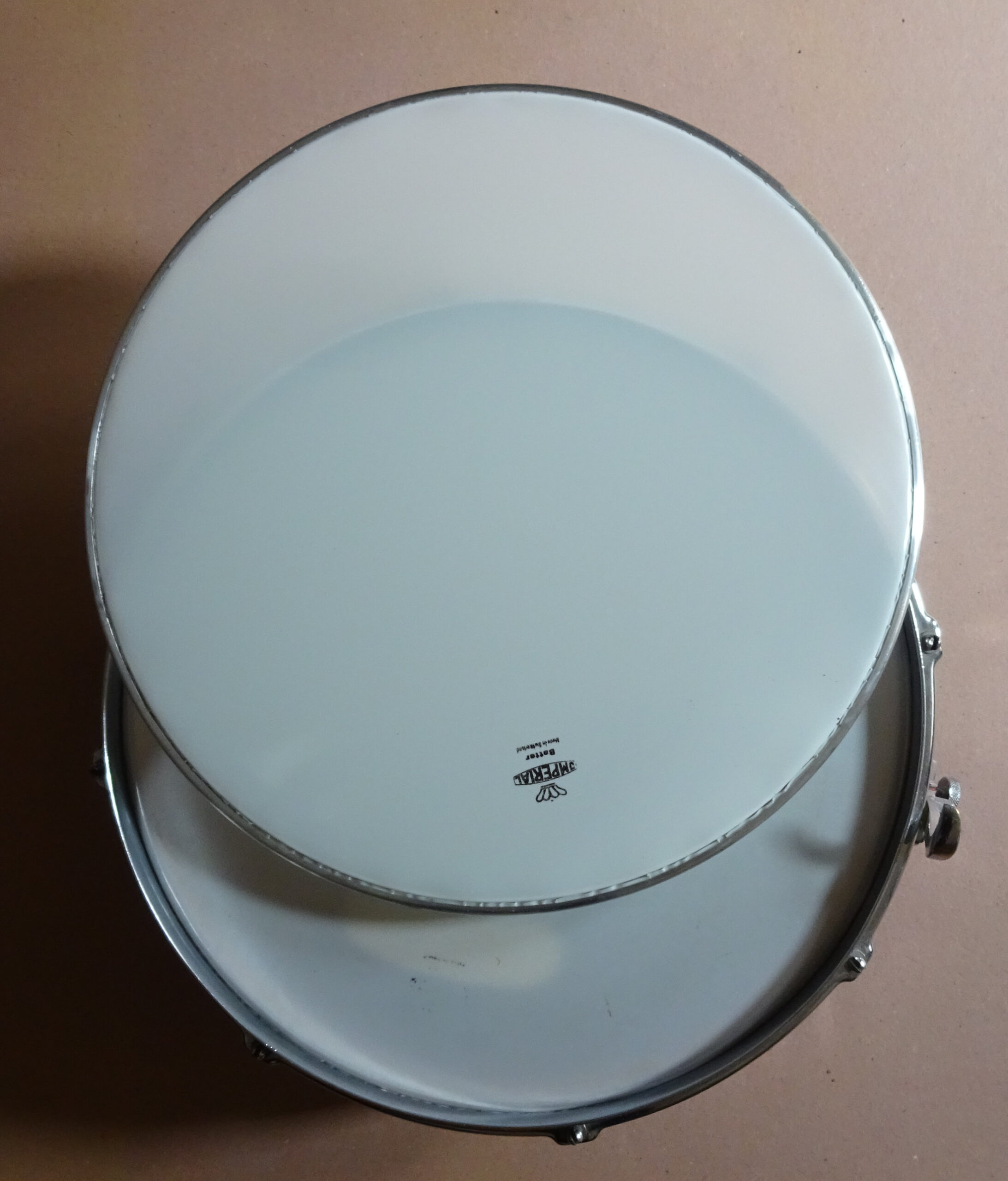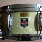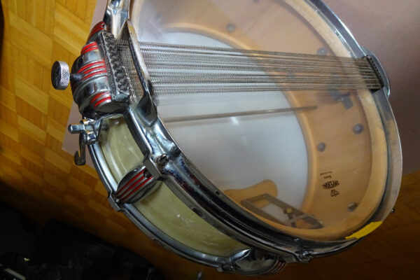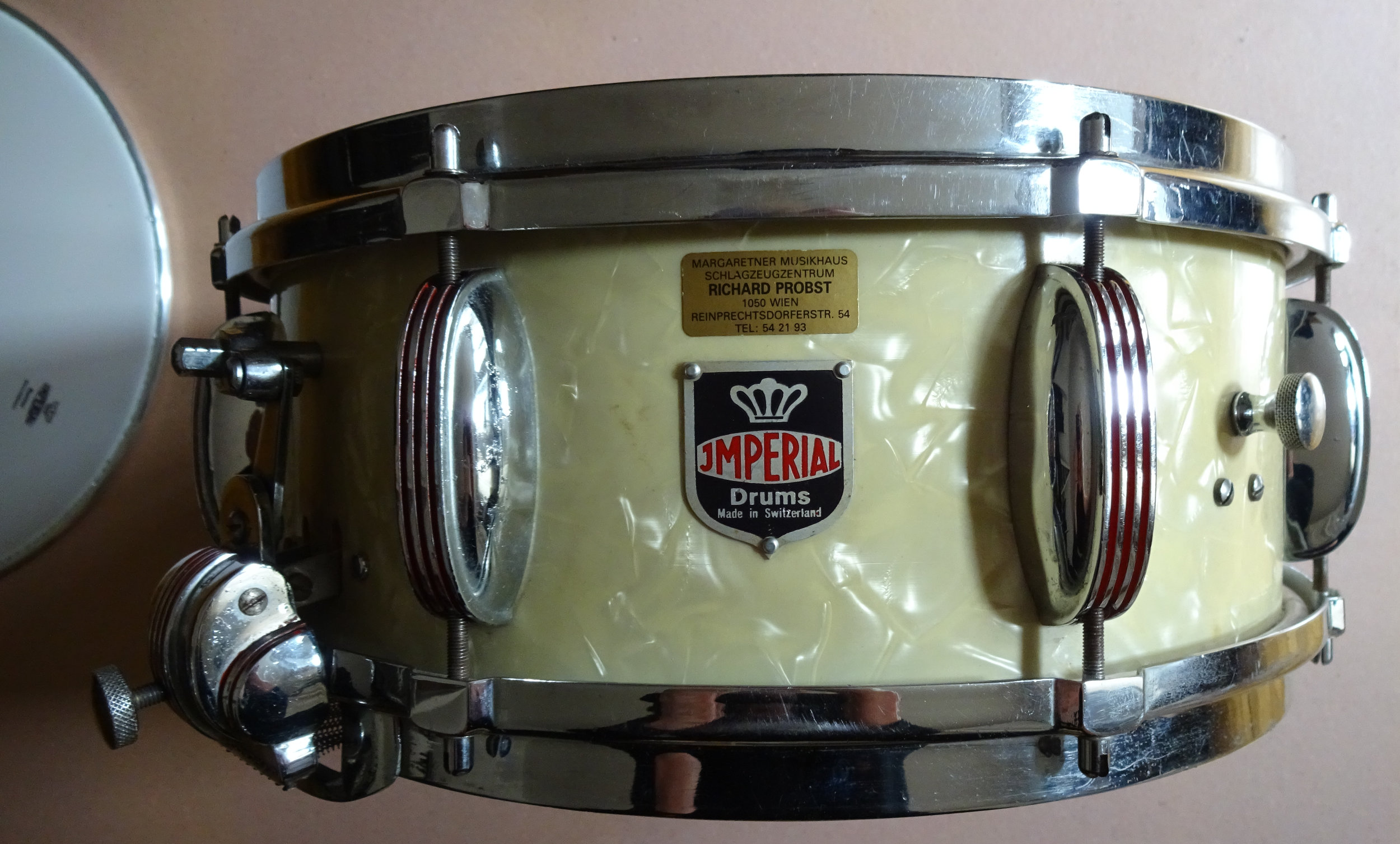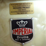 Vintage-Snare von Imperial Swiss. Ca. 1950, Grand Lux-Serie. Sehr guter Zustand, wunderbarer Sound. Korpus-Höhe 13 cm, Verchromte Messingreifen, Parallelabhebung, Innendämpfer, Snare-Federn einzeln spannbar, Federnspannung gesamt mit Feinjustierung. Originale Imperial-Kunststofffelle, zusätzlich ein neues Schlagfell. Die Trommel war unter der Obhut vom Wiener Trommelspezialisten Richard Probst.