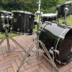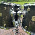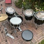 Wunderschönes Set, dunkelgrün mit goldenen Spannböcken, wenig gespielt, nur altersübliche Gebrauchsspuren. 22″BD, 12″, 14″, 16″ Mounted Toms, 14″ Holzsnare. Hardware Yamaha: 2x Beckenständer, 1x Tomstand mit Doppelhalterung (YESS System), HiHat mit Paiste 404 14″. Baujahr ca 1990.